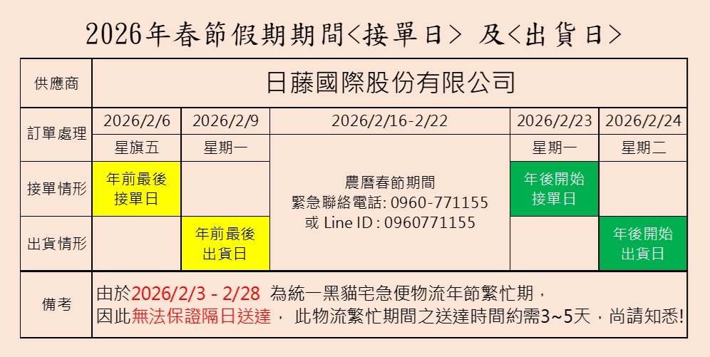 Hot News 最新消息 2026年春節假期期間 <年前最後接單日> 及 <年後開始接單日> 2026-01-16 < 公 告 > 由於春節期間,物流運輸進入物流繁盛期,為確保商品順利送達, 以下資訊,敬請知悉! Back
